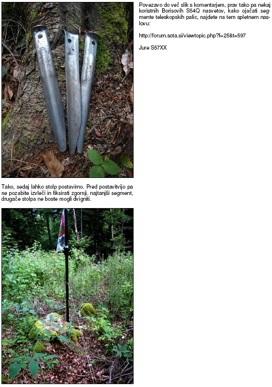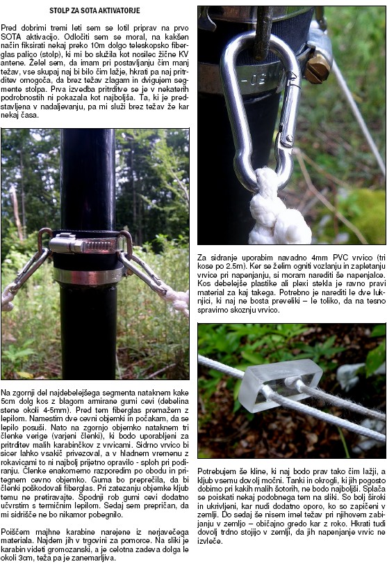 Tukaj je moja rešitev glede ojačanja in fiksiranje stolpa za sota delo.Seveda brez nasvetov in izkušenj bi šlo malo bolj slabo.V praksi je to izgledalo takole. Najprej sem vsak segment na koncu 1 cm v širino rahlo zbrusil z finim smirkovim papirjem nato pa premazal z dvokomponentnim lepilom, ki ga uporabljajo v tovarni Veplas Velenje. Ker se lepilo precej hitro suši sem moral takoj začeti z navijanjem kevlarske vrvice, lepilo ki pa je ostalo viška pri navijanju pa sem moral še enkrat lepo oblikovati okoli palice.Lepilo se v trdnosti lahko primerja z "železom" saj se lahko oblikuje edino z pilo ali zelo grobim smirkovim papirjem.Po nasvetu prijatelja sem okoli navil še platneni samolepilni trak, "v takšni debelini da sem segmente lahko zložil do tega obroča" ki sem ga še malo premazal z lepilom. Na kraju sem vse še enkrat premazal z lepilom, zbrusil in z prozornim lakom naredil finiš. Za sidranje sem se isto držal nasvetov radioamaterjev v prejšnih temah, vendar sem namesto členov verige uporabil tri male ovalne karabinčke in dve objemke. Obe objemke sem speljal okoli karabinčkov in palice. Slike bodo povedale malo več.Hvala vsem za nasvete. https://picasaweb.google.com/1101928034 ... ZaSotaDelo